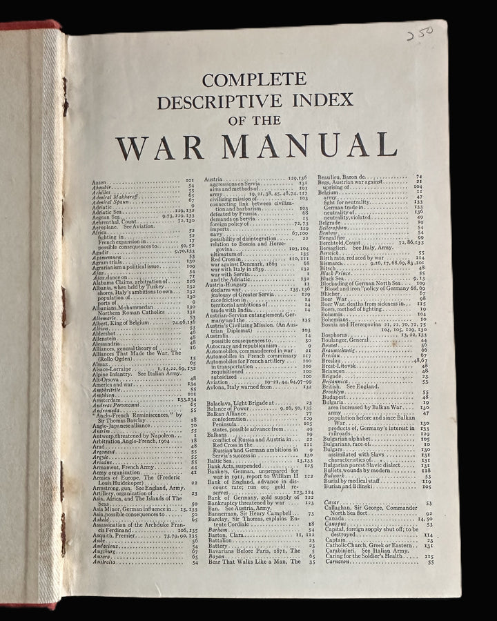 Internally, the pages are complete and firmly bound. Paper exhibits age toning consistent with early 20th-century publication. Illustrations and text remain legible and well printed. The index pages demonstrate the breadth of coverage, listing nations, military units, political leaders, battles, and diplomatic events alphabetically for reference use. No modern repairs or rebinding are evident.