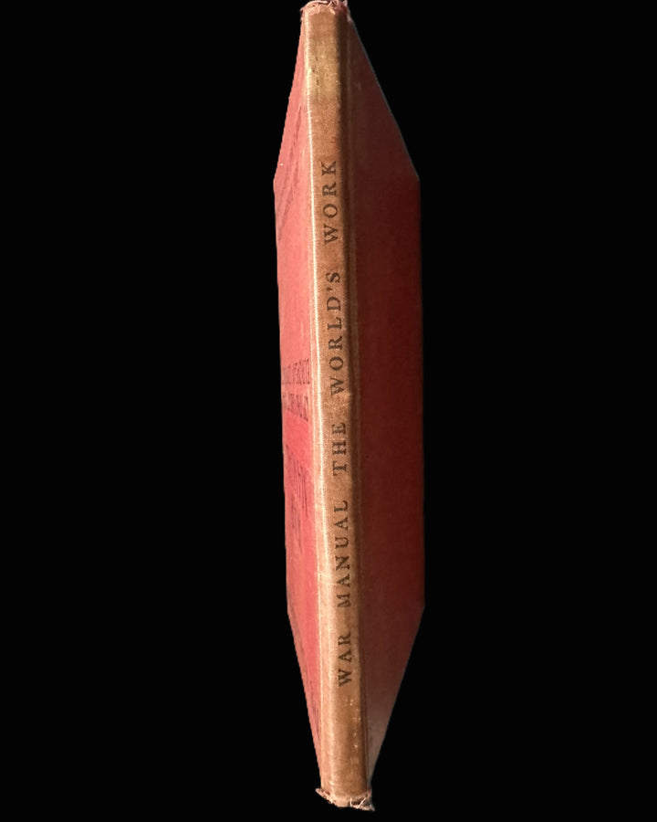 Physically, the book is bound in its original red cloth boards with black-stamped titling on the front cover reading WAR MANUAL and OF THE GREAT 1914 EUROPEAN CONFLICT, with The World’s Work printed at the top. The spine is titled War Manual – The World’s Work. The binding is intact, with evident period wear. The cloth shows surface fading, rubbing, and edge wear, particularly along the spine and corners. The spine remains present but softened, with fraying visible at the head and tail.