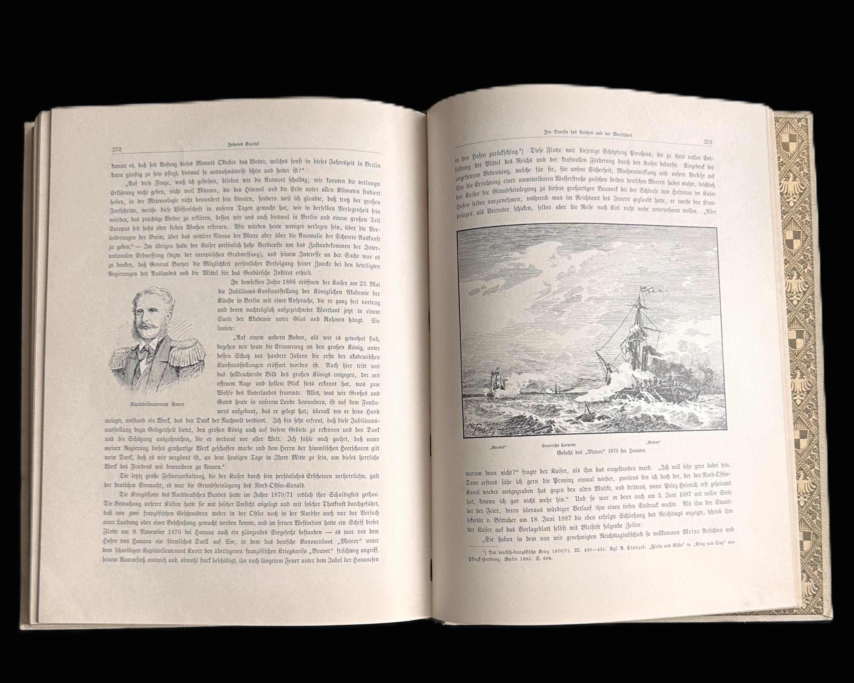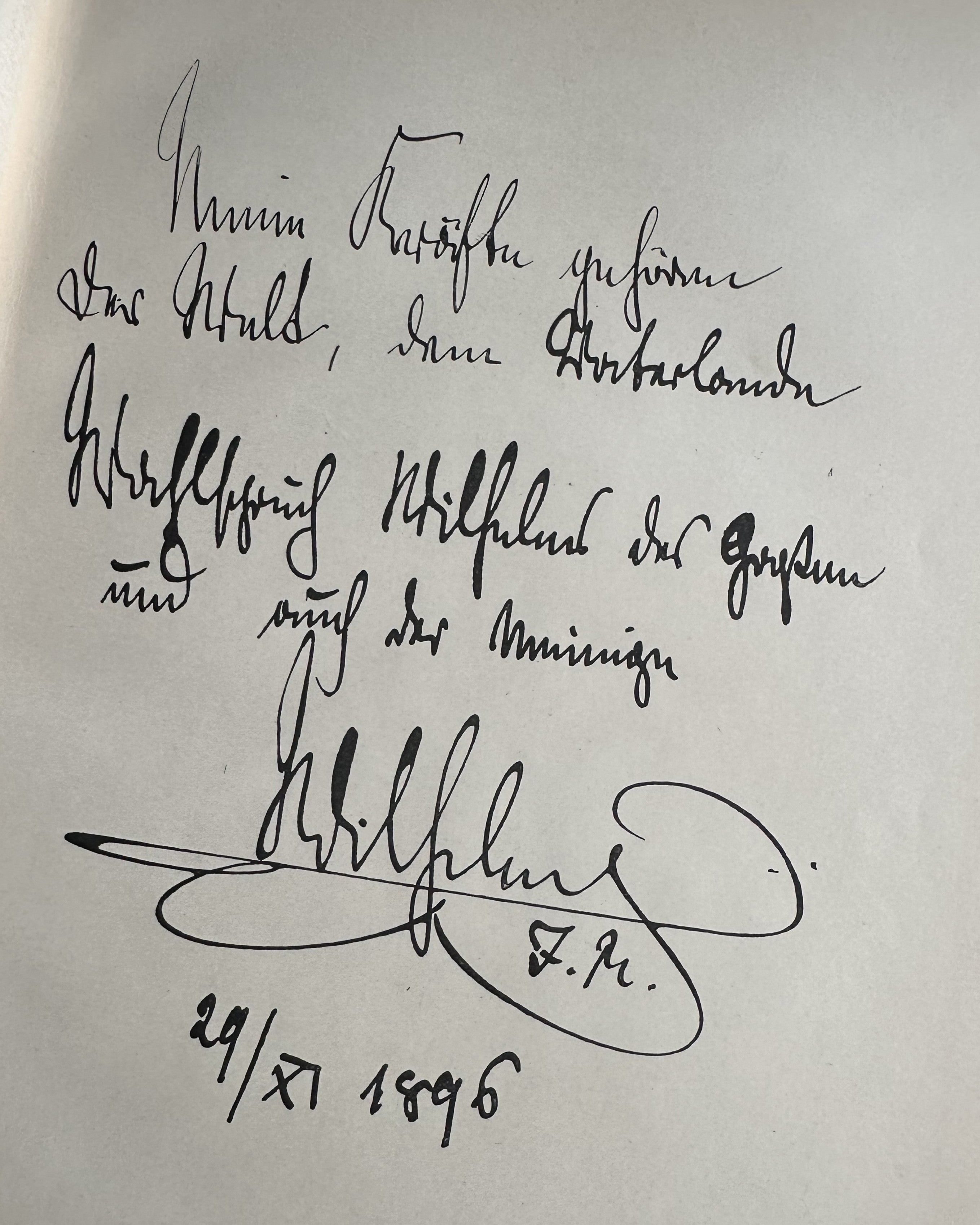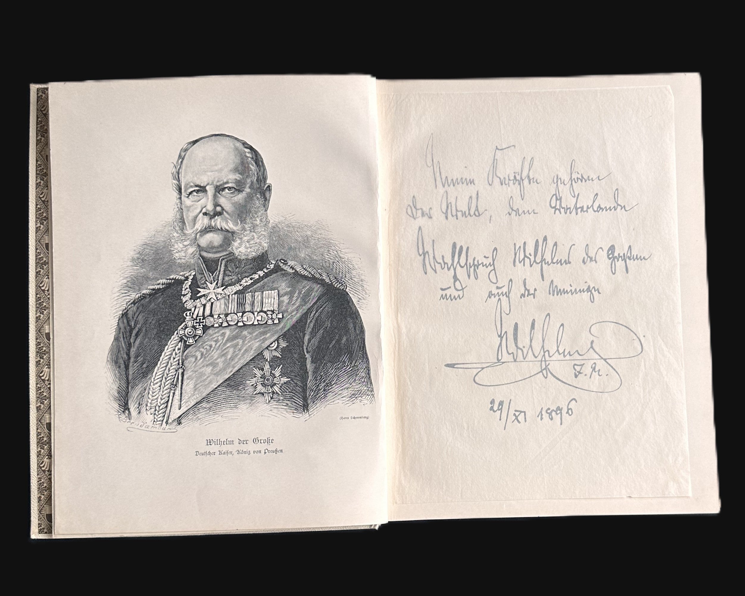 Of special note is a dedication inscription dated 1896 and the striking facsimile signatures of Kaiser Wilhelm I, adding to its historical gravitas. The interior remains clean and well-preserved with strong paper and crisp text.