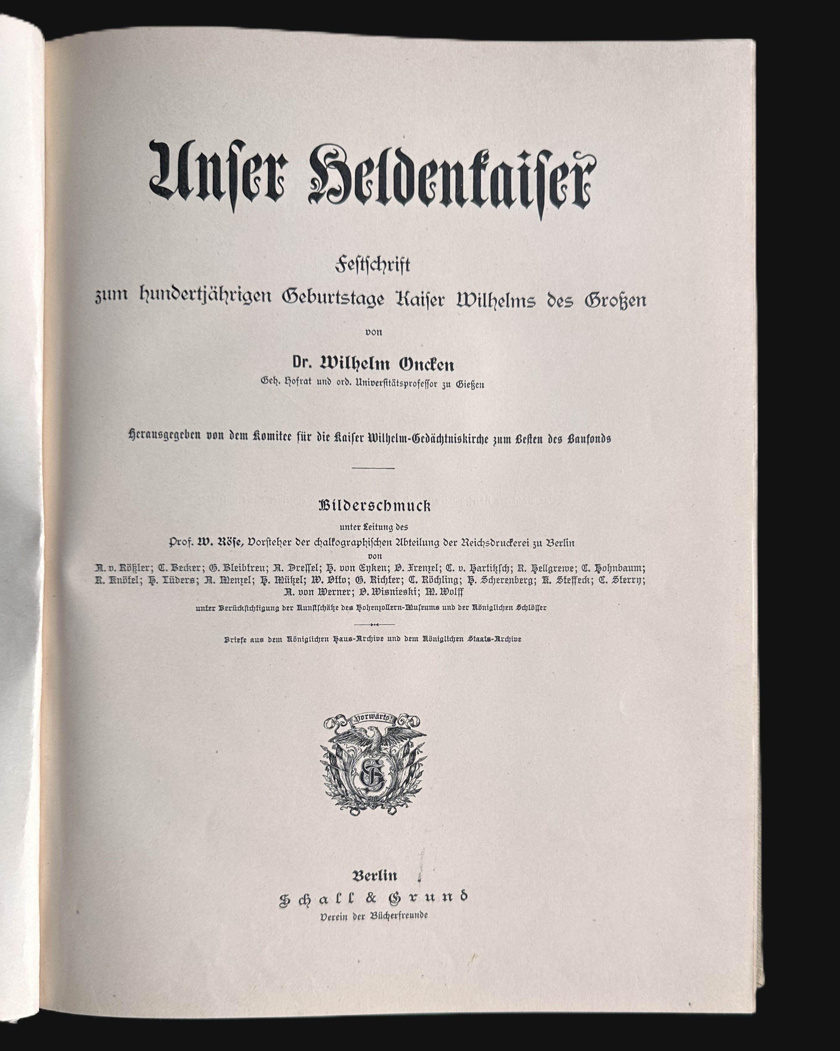 Offered here is an exceptional Imperial German commemorative volume Unser Heldent Kaiser, published in Berlin in 1897 by Schall & Grund to honor the centennial birthday of Kaiser Wilhelm I, the first German Emperor. This deluxe Festschrift was authored by Dr. Wilhelm Oncken, a noted professor of history, and richly produced with illustrations directed by Professor W. Büße of the Reichsdruckerei (Imperial Printing Office).