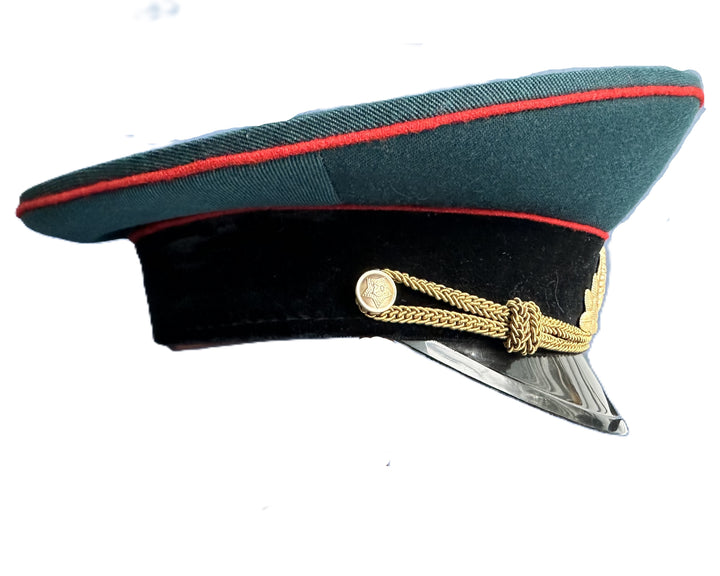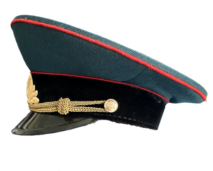 This USSR Army General’s visor cap is an authentic piece of Soviet military headgear, typically worn by generals and high-ranking officers. The cap features a dark green top with red piping, signifying its general officer rank, and is adorned with a large gold-embroidered Soviet star and wreath emblem on the front, symbolizing the Communist Party's control over the military. The cap has a sturdy visor, decorated with gold cords that are attached with star-inscribed buttons.