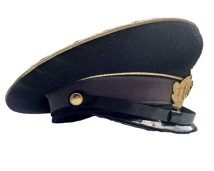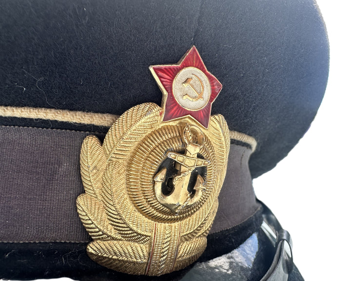 This authentic Soviet Navy Admiral visor cap dates back to the Cold War era, symbolizing the highest ranks within the Soviet naval forces. The cap is adorned with the classic Soviet red star, featuring the hammer and sickle emblem, representing the Communist regime. Below the star sits a gold embroidered anchor, surrounded by golden leaves, signifying naval command and authority. The black wool top and band are bordered by golden piping, with a synthetic leather chinstrap completing the look. The visor is constructed from black lacquered leather, showing some natural wear consistent with age.