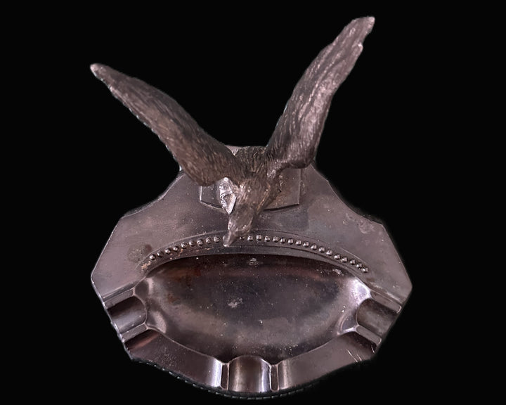 This striking vintage metal ashtray features a powerful, dimensional spread-winged eagle perched at the rear of the base—an emblem commonly associated with strength, authority, and German imperial symbolism. Cast from what appears to be pot metal or spelter with a darker silvered or pewter finish, the eagle displays sharp, lifelike feather details and talons gripping a raised platform. The base of the ashtray is elegantly contoured with scalloped corners and smooth, integrated grooves for resting cigarettes or small cigars. A beaded arc design adds a decorative flair across the back portion of the tray.