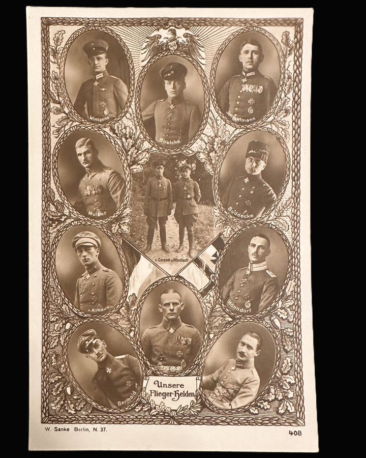 Offered here is an original Imperial German Great War aviation postcard by the famed Berlin publisher W. Sanke (card no. 408), titled “Unsere Flieger-Helden” and presenting a montage of celebrated German fighter aviators (“aces”) framed in an ornate oakleaf border beneath the Imperial eagle. This is a period-produced propaganda/hero-card intended for public sale and collecting during the war years, featuring portrait ovals and a central field photograph, all identified by printed name captions.