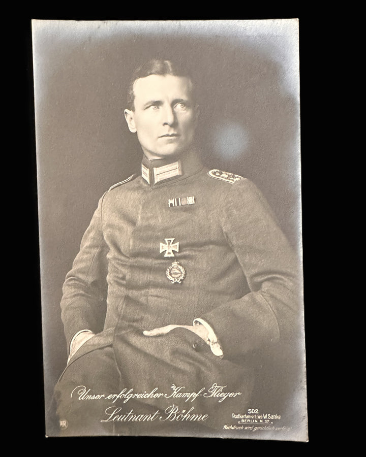 Original Imperial German aviation portrait postcard from the celebrated W. Sanke (Berlin) military series, depicting “Unser erfolgreicher Kampf-Flieger Leutnant Böhme” in full dress tunic with high decorations. This is a period photographic postcard intended for the wartime home-front and collector market, using the era’s most recognizable “ace” visual language: a confident studio portrait, neck-worn Pour le Mérite, Iron Cross, and flying qualification badge—an immediately legible status set to German audiences of 1916–1918 and still the visual shorthand for elite Jagdflieger prestige among collectors today.