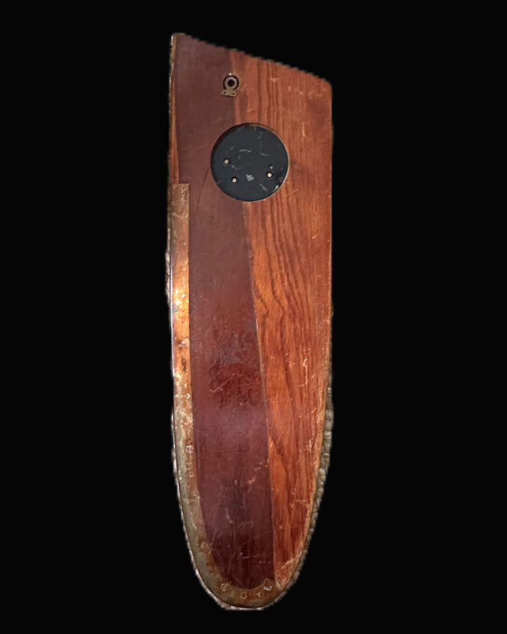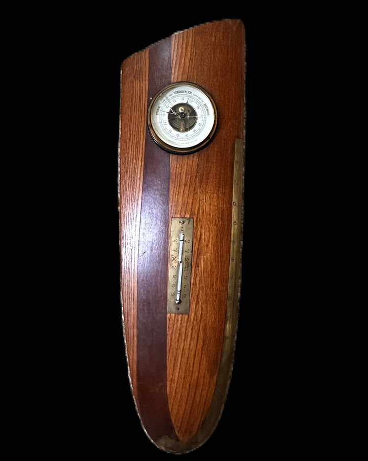 This striking wall-mounted weather station is a beautiful and functional artifact crafted from an authentic segment of a German aircraft propeller—most likely from a World War I-era wooden biplane. The elegant curvature of the laminated wood, reinforced with a brass leading edge, strongly suggests its origin from a propeller tip. The rich wood grain remains vibrant, having aged gracefully with decades of patina and subtle wear from long-term handling or display.