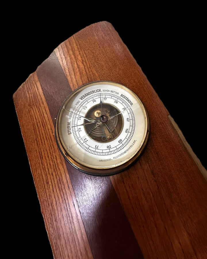 - A barometer, signed “Original Flugzeugpropeller,” with full German-language readings such as Sturm, Regen, Veränderlich, Schön Wetter, and Beständig—classic meteorological terms from the early 20th century.