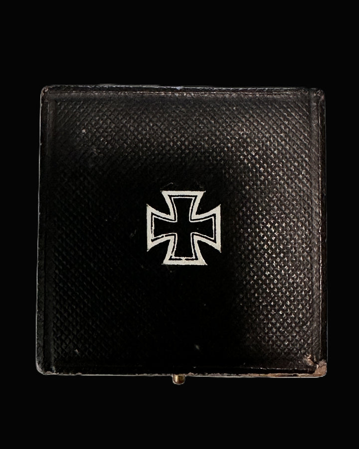 The accompanying case is a desirable component in its own right and materially elevates collector appeal. It is the correct compact square presentation/storage case finished in black textured covering, with a white Iron Cross motif applied to the lid. The interior is period-correct: a light (white/cream) ribbed silk lid lining and a black velvet base with a shaped recess sized for the cross and pin, designed to keep the decoration stable and protected. The hinge area shows the expected cloth or ribbon element, and the overall interior layout presents as authentic to early 20th-century German award cases. The case exterior exhibits normal edge and corner wear, including small areas of scuffing and surface abrasion at the corners—exactly what one expects from a case that lived in a drawer, kit bag, or family effects for a century. Importantly, the case still provides a strong “complete set” presentation, which is increasingly difficult to source as many crosses were separated from their cases over decades of collecting and estate dispersal.