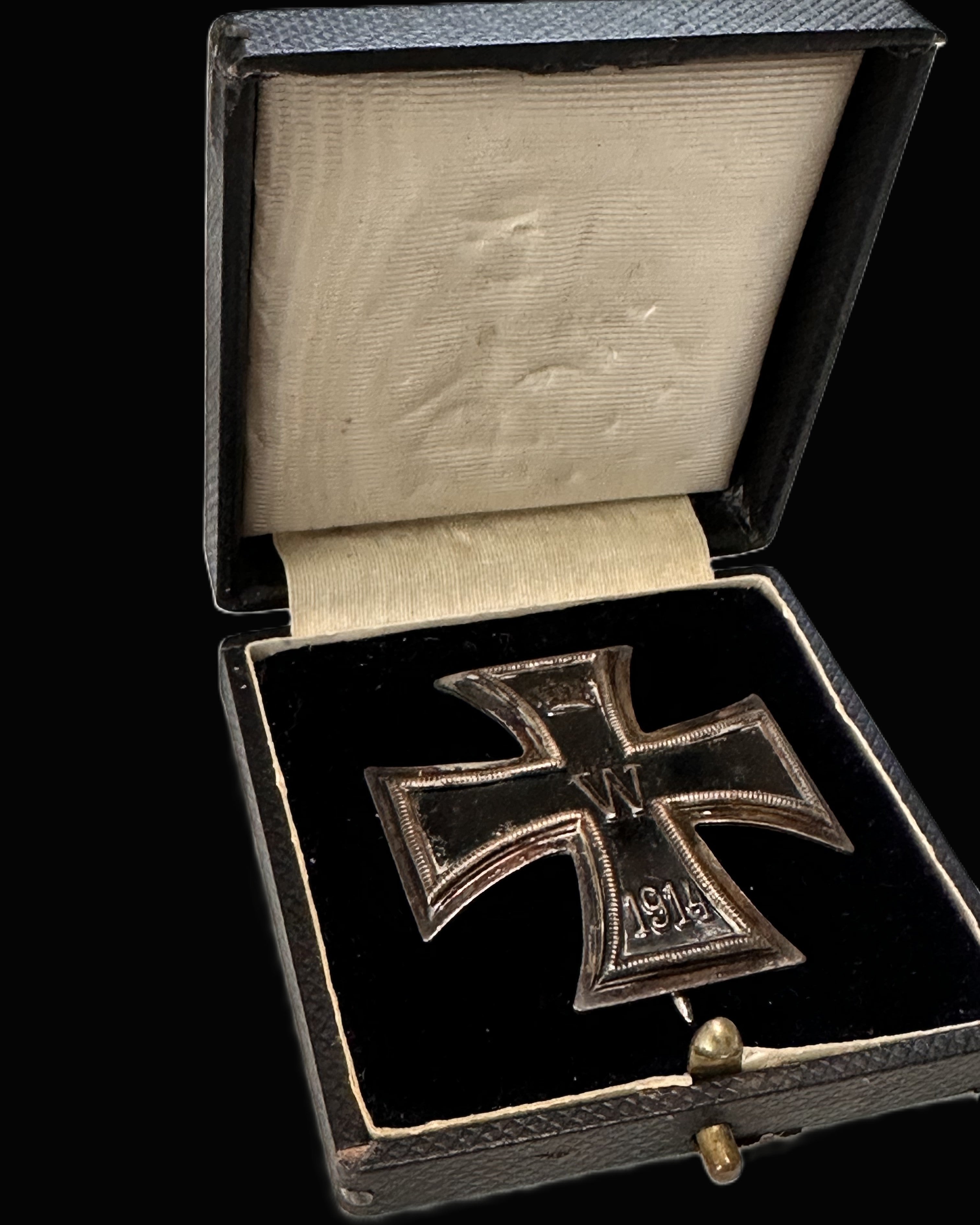 Offered here is a cased Imperial German Iron Cross 1st Class (Eisernes Kreuz 1. Klasse) of the 1914 pattern, a classic vaulted example presented in its period storage case. The decoration is the familiar three-piece construction associated with WWI production: a blackened iron core retained within a separate silver (or silvered) frame, finished with a crisp beaded edge bordering the arms. The obverse displays the crowned Prussian royal cipher “W” at center, with the date “1914” on the lower arm, and the Imperial crown at the top—iconography executed with sharp relief and correct proportions. The cross shows the subtly domed, “vaulted” profile sought by collectors, with the frame rising cleanly off the core and the arms retaining their shape without flattening from misuse.