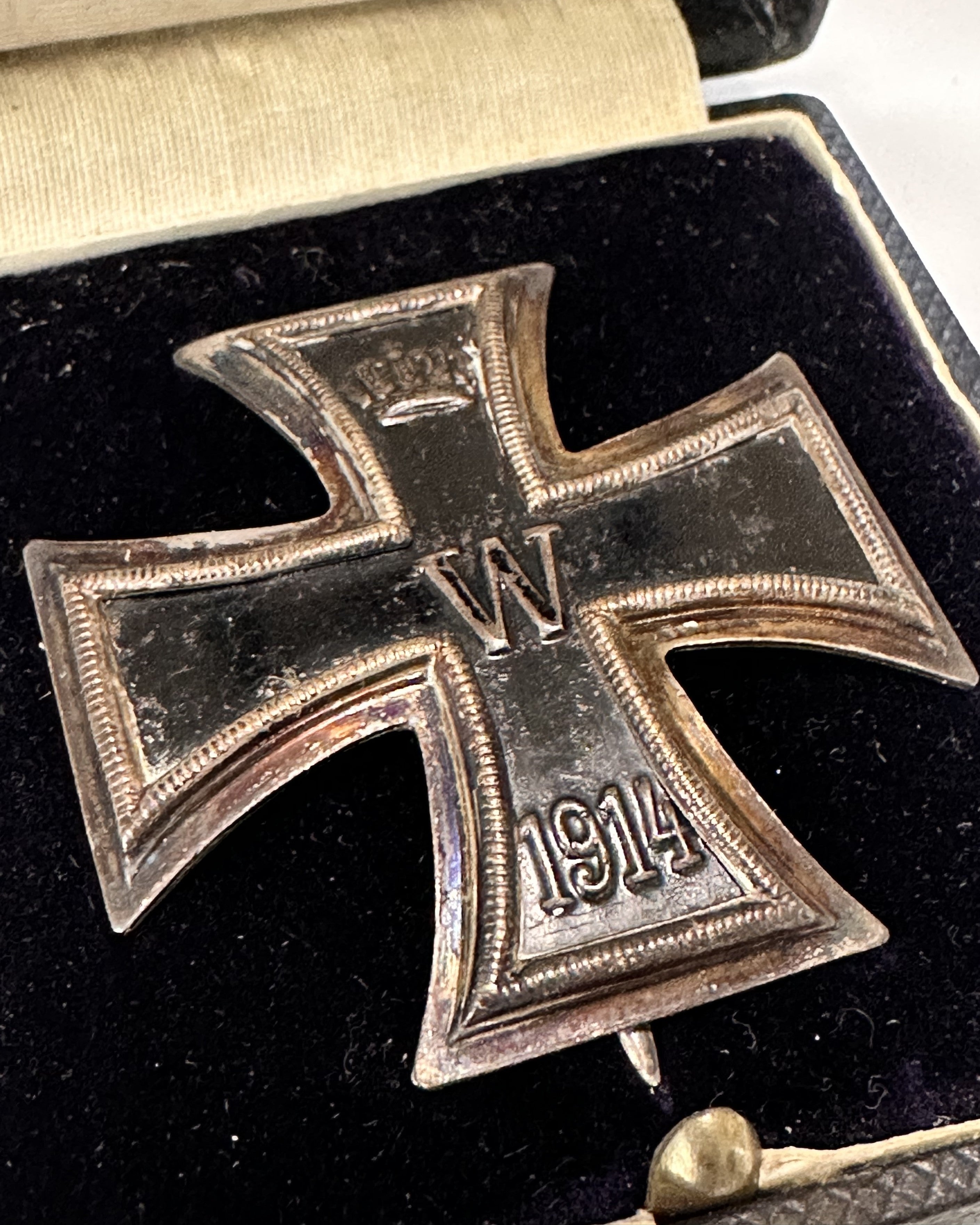 From a collector’s perspective, the vaulted 1914 EK1 remains a cornerstone item because it sits at the intersection of battlefield history, recognizable design, and disciplined German manufacturing standards. The beaded frame, the sharp crown detail, and the bold “1914” date are not just decorative elements—they are the branding of a nation at war and a monarchy attempting to project continuity, legitimacy, and martial tradition under the pressure of industrialized conflict. The fact that this example is paired with its case adds an additional layer of authenticity and display value. Cased EK1 sets present exceptionally well in a collection, and they are ideal for curated groupings—whether focused on a particular regiment, a themed WWI display, or a broader survey of Imperial German awards. The case also protects the finish and makes the piece a ready-made centerpiece for collectors who value completeness and original period accompaniments.