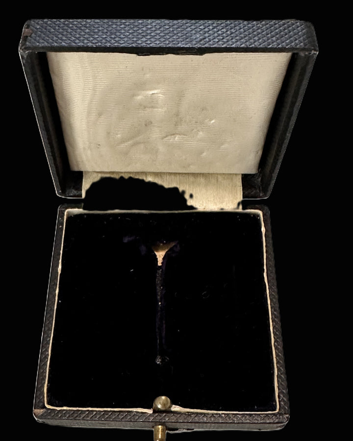 Condition is best described as very good, with expected age wear. The cross shows honest patina, light scuffing, and high-point rub to the frame and core consistent with a century of careful handling. The pin and hinge/catch assembly appear intact and functional, with no obvious breaks or crude repairs visible in the images provided. The case shows typical exterior edge wear and scuffing, with the interior silk and velvet presenting well overall while showing minor impressions and age-appropriate marks. Nothing here reads as “over-cleaned” or artificially bright; the set retains the restrained, time-earned appearance advanced