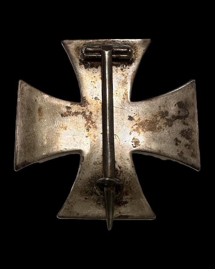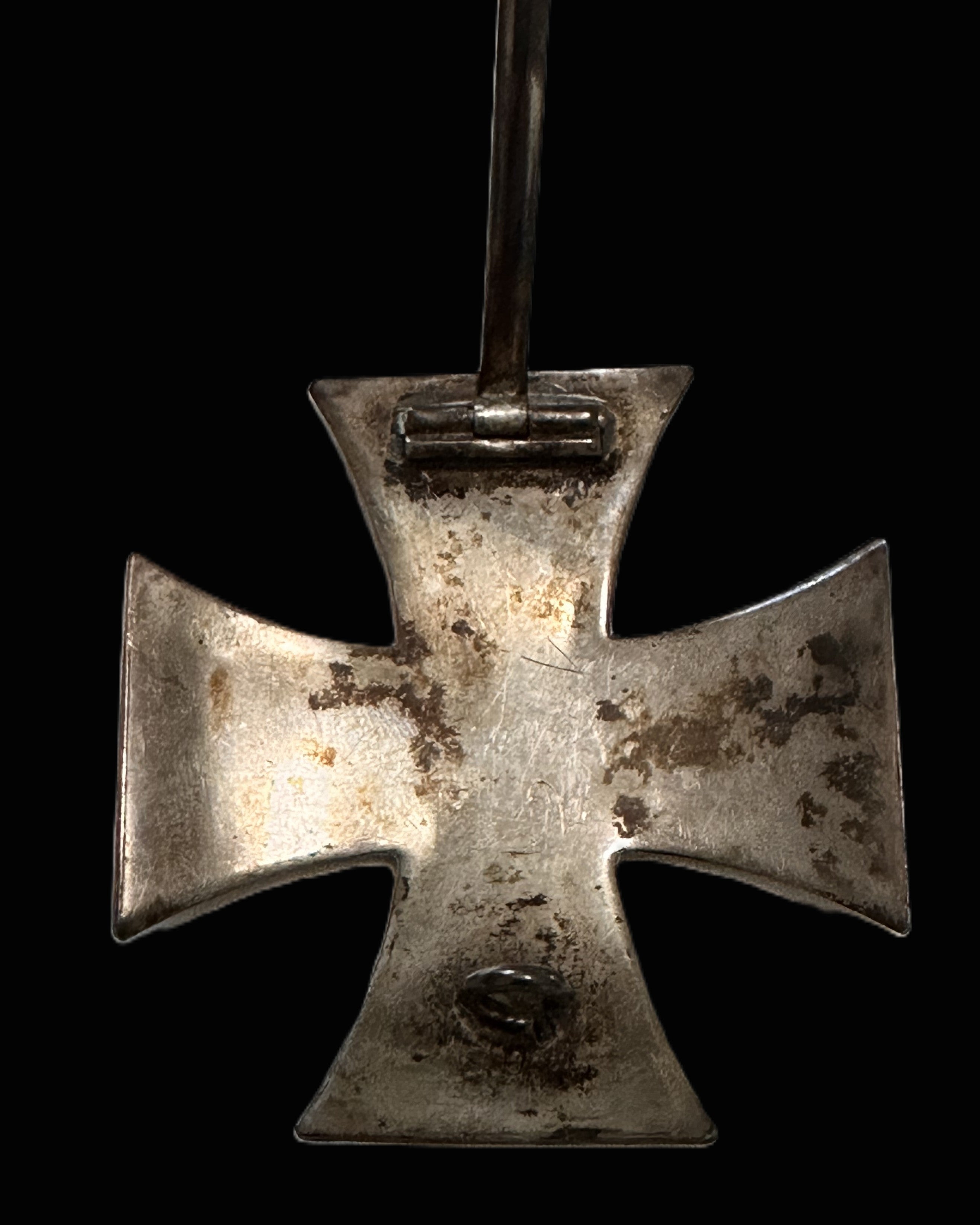 The reverse is fitted with a long vertical pin assembly, hinged at the upper arm via a barrel hinge and secured at the lower arm by a round wire catch. This is the correct, field-practical fastening style used for an award intended to be worn through the tunic’s left breast pocket. The hardware appears period and consistent in finish and wear with the body of the cross, showing no obvious modern replacement components in the provided views. No maker mark is visible in the photographed areas; many original EK1 examples were left unmarked, and a lack of visible marking in hand should not be treated as a red flag by itself. The frame shows attractive age toning and handling patina, with honest high-point rub where the silver finish naturally brightens on the beaded edge and raised corners over time. The core retains its dark finish overall, with typical surface wear and scattered rubbing consistent with careful wartime or postwar handling rather than abuse. As with most genuine WWI EK1s, the core should be ferrous; a simple magnet test is recommended for documentation, but the construction and appearance here align with an original iron-core piece.