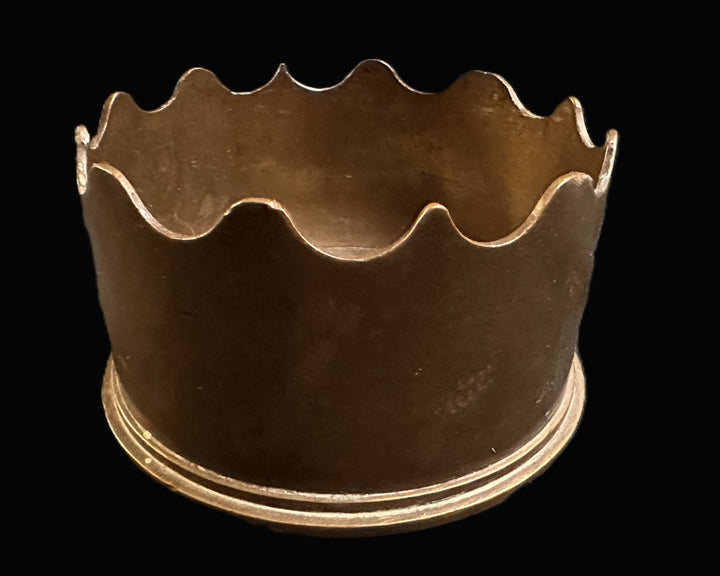 The fuze is constructed of solid brass, originally machine-turned for ordnance use. The exterior retains its heavy cylindrical form with a scalloped crown profile, now further refined by hand. The upper rim has been cut down and evenly reshaped into a decorative, wave-patterned edge, clearly distinct from factory ordnance finish. The interior has been hollowed and smoothed, converting the former fuze body into a usable container or small vase. The base remains flat and heavily machined, with concentric lathe marks visible.