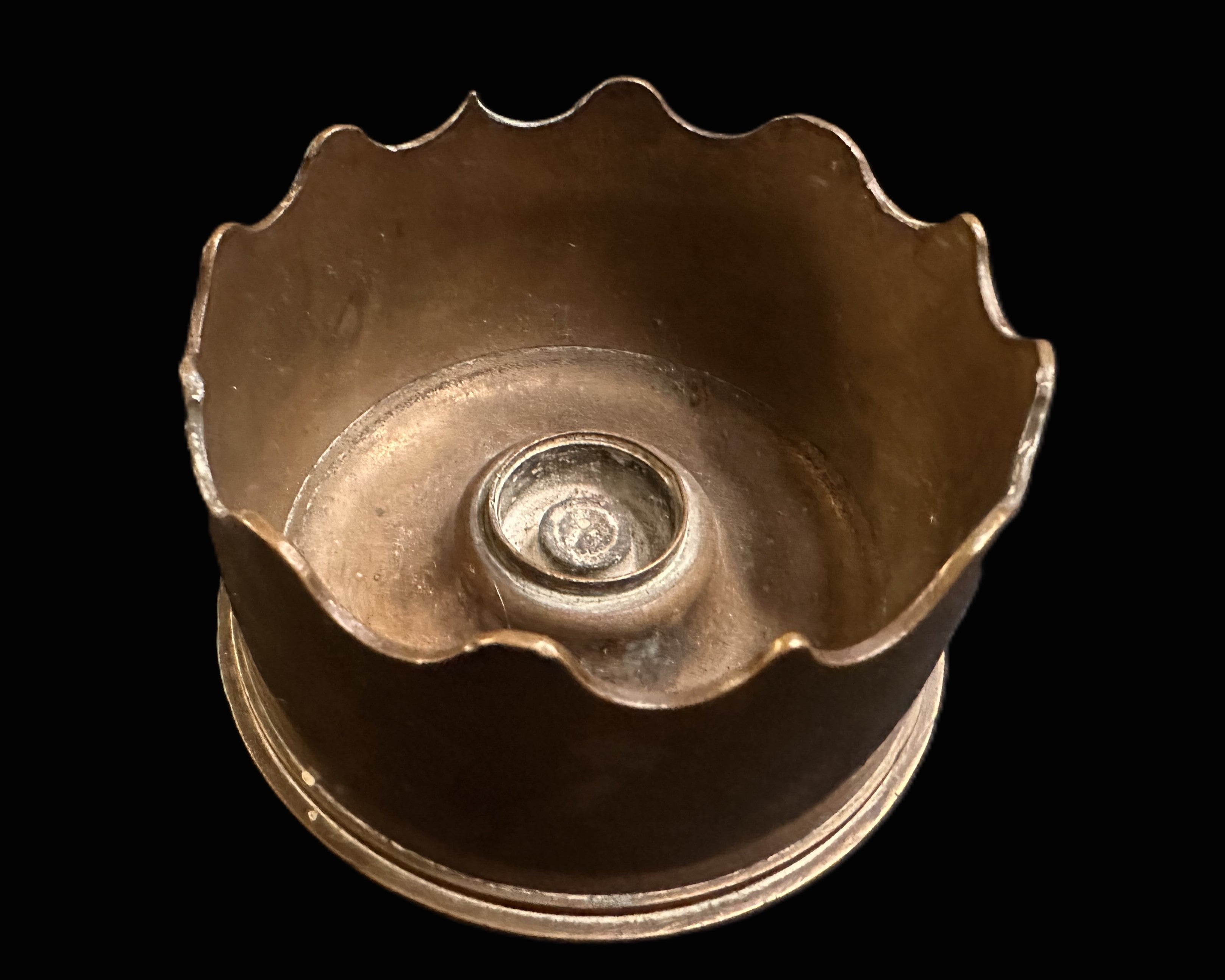 The hand-worked nature of this piece places it firmly within authentic WWI trench art, rather than later decorative brassware. The reshaped rim, hollowed interior, and retention of original ordnance markings are all characteristic of period conversions undertaken during or shortly after the war.
