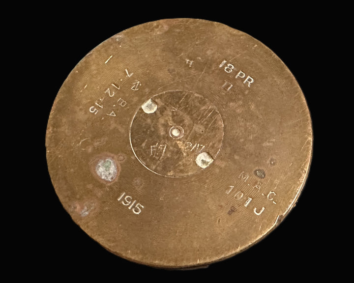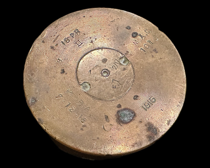 The underside bears clear and legible British ordnance markings, including “18 PR” (18-Pounder), inspection or pattern markings, and the date “1915.” These markings are struck in the standard British style and firmly establish the fuze’s original identity and wartime manufacture. German Imperial artillery components were designated by metric caliber and marked “Z.” for Zünder (fuze); this example conforms entirely to British marking conventions.