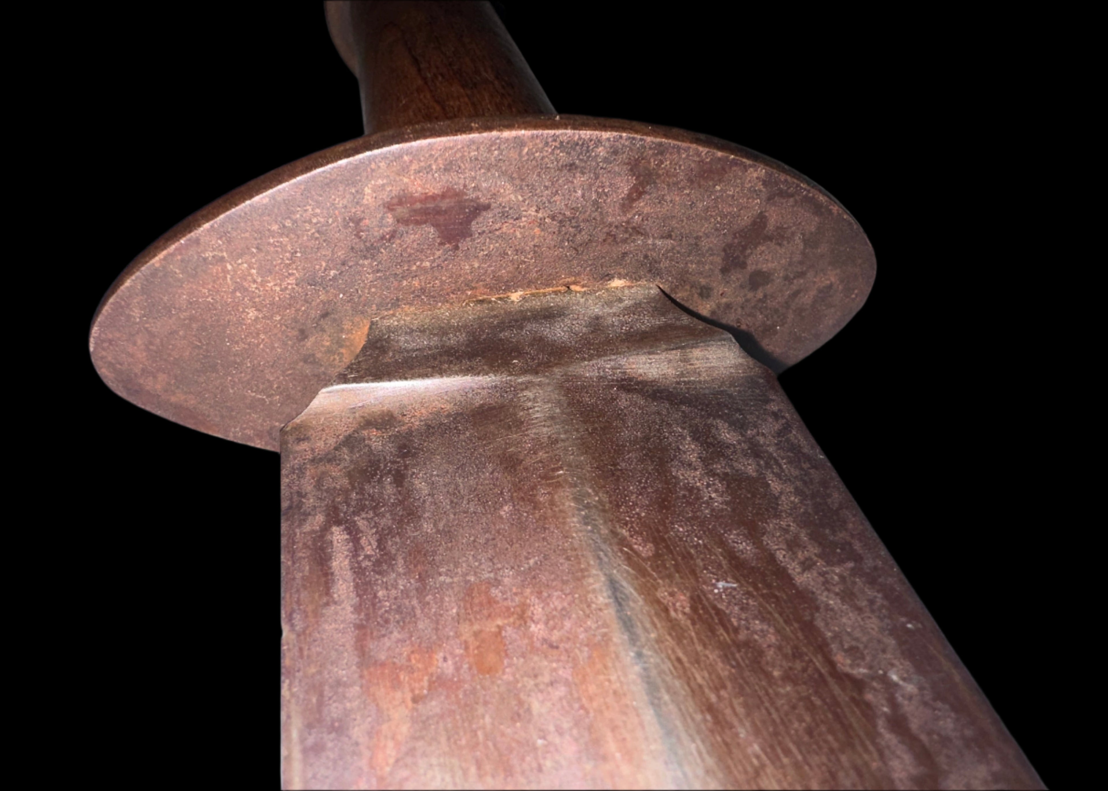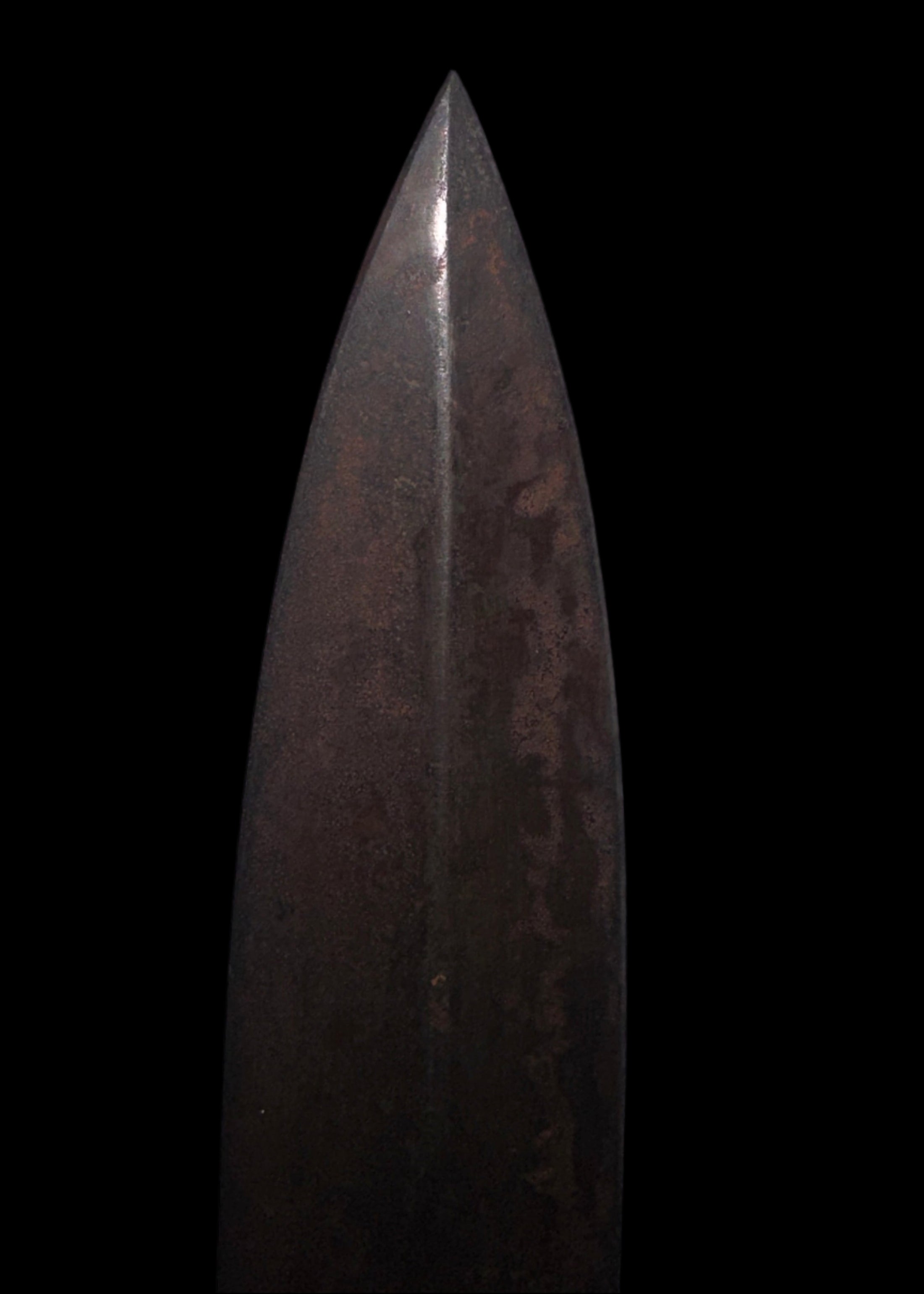 Blade: Heavy spearpoint with age patina, oxidation, and edge darkening; no active rust