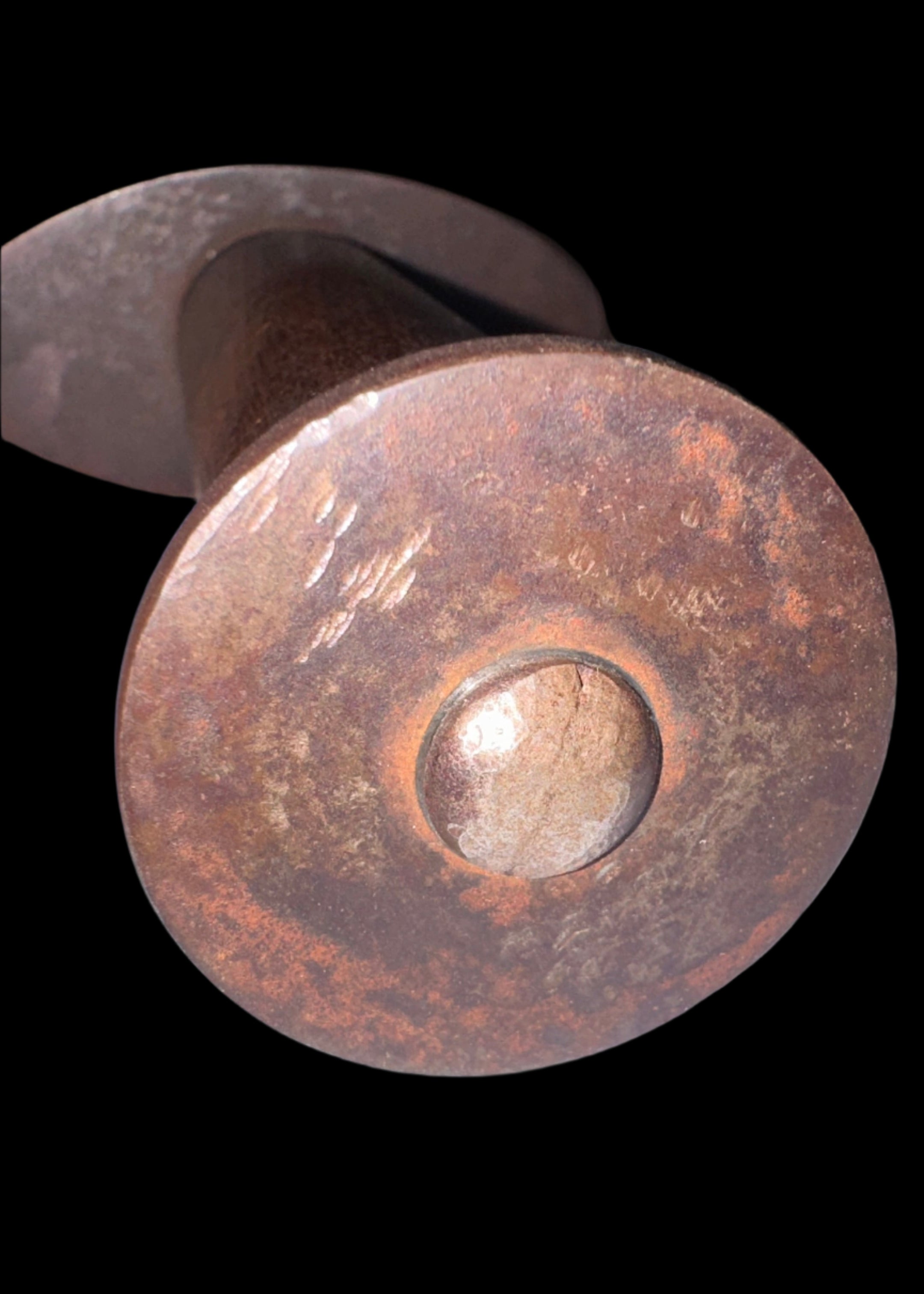 This knife’s sheer weight—approximately 1.5 pounds—combined with the thick, spear-shaped blade, reflects the brutal nature of trench warfare, where weapons like this were as much tools as they were instruments of war. The overall design is reminiscent of earlier Bowie and Arkansas toothpick forms, but tailored for mass production and extreme conditions. It should be noted this knife does not include a scabbard.