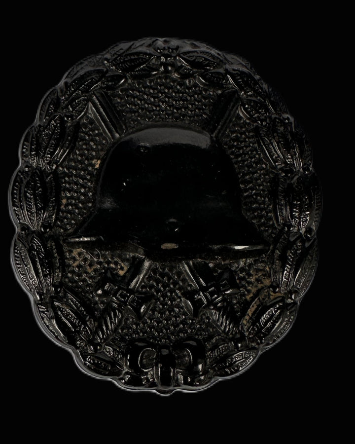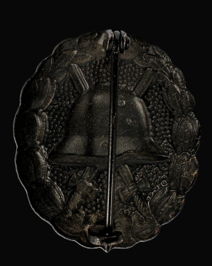 This is an authentic World War I-era German Black Wound Badge (Verwundetenabzeichen in Schwarz), awarded to Imperial German soldiers wounded once or twice during combat. This example is the first grade of the badge, featuring the iconic Stahlhelm (steel helmet) over crossed swords, framed by an oak leaf wreath.