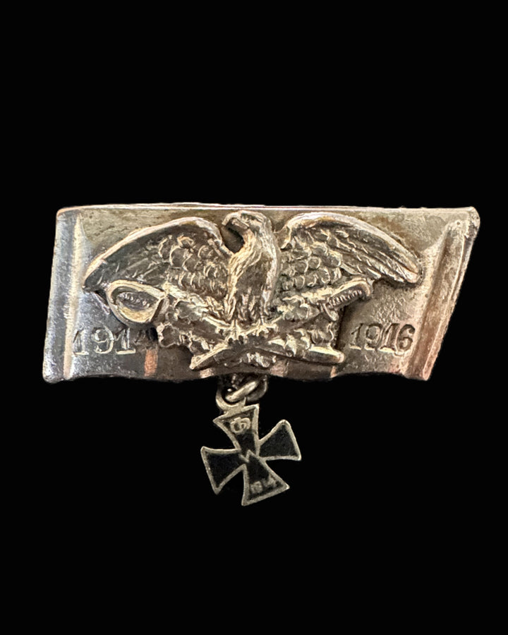 A striking wartime patriotic brooch, die-cut from repurposed brass in the manner of trench-art jewelry. The central motif depicts the imperial German eagle grasping a sword and laurel branch, framed by the dates 1914 and 1916. Beneath it hangs a small, finely detailed Iron Cross charm marked “W” and “1914.” The backing shows a crosshatch texture typical of hand-worked shell brass, with a horizontal pin and C-catch still intact. Measuring approximately 44 mm wide, the piece retains its subtle silvered wash and warm period patina.