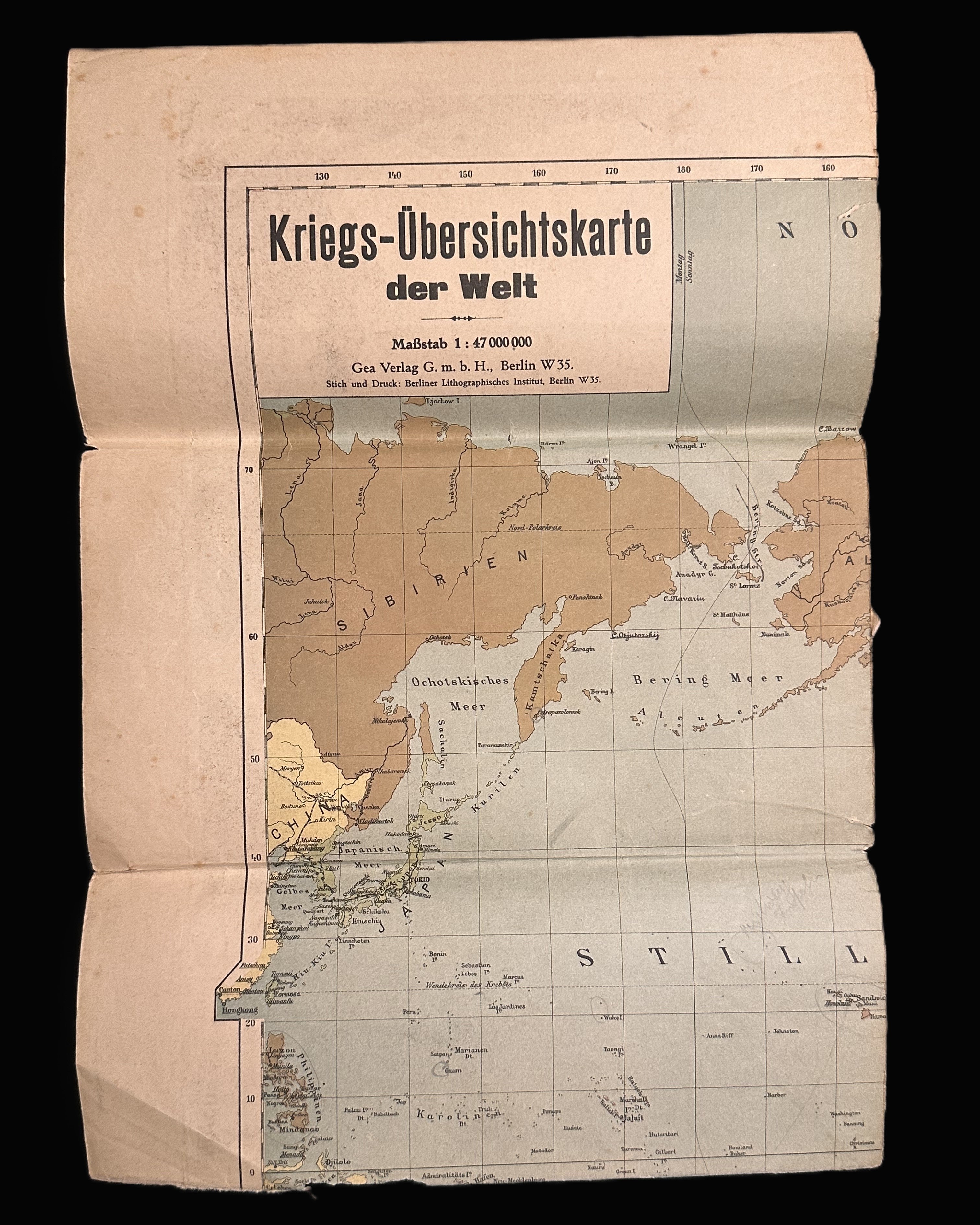 Physically, this example is a multi-panel folding paper map printed in color lithography. The paper stock is thin but robust, consistent with mass-issued wartime reference maps intended for civilian education, military orientation, or home-front use. Fold lines are clearly visible, with edge wear, small losses, and toning consistent with age. The corners show rounding and minor separation, and there are scattered stains and creases, all expected for an unrestored period piece. Despite this, the map remains fully legible, visually striking, and complete, with no modern reinforcement or repair observed.