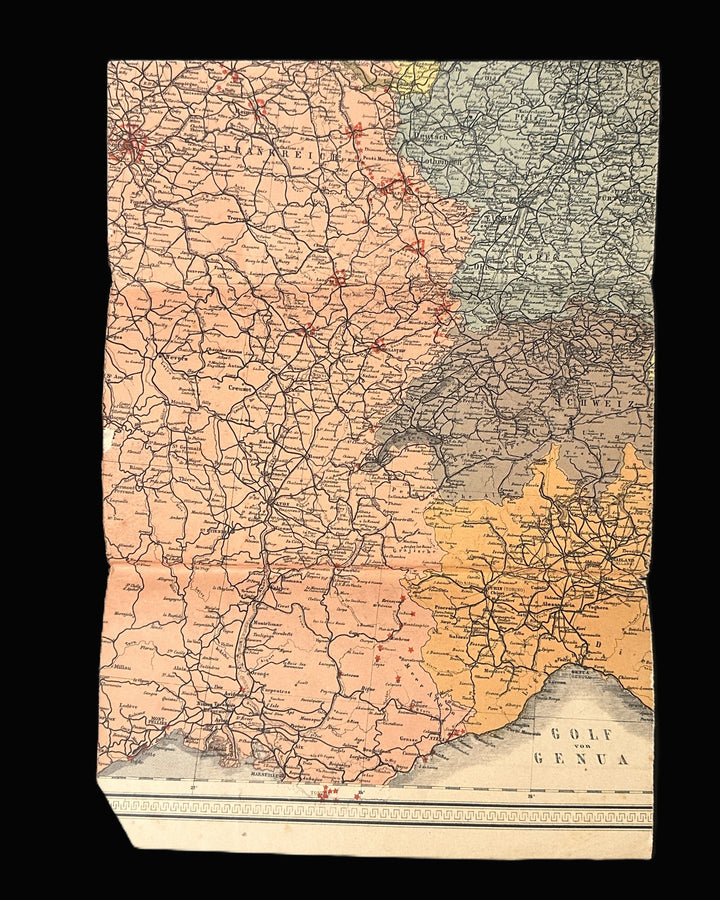 Good original condition overall. Expected fold wear throughout, with edge fraying, corner losses, and age toning. No major tears into the printed map field. Colors remain clear, and all text is legible. An honest, collector-grade example with no restoration.