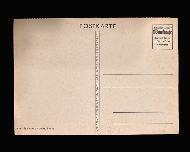 The postcard is printed on light-toned cardstock typical of wartime German production. The front shows even printing and good contrast, with no hand coloring or later embellishment. The reverse is a standard divided postcard back marked “Postkarte,” published by Verlag Die Wehrmacht G.m.b.H., Berlin W 8, Kronenstrasse 37. A printed emblem in the upper right advertises “Die Wehrmacht – Deutschlands größte Wehr-illustrierte,” identifying the card as part of a militarily themed publication network aimed at patriotic distribution. The credit line “Phot. Sammlung Handke, Berlin” appears at lower left, indicating the image source. The card is unused, with no writing, postage, or address present.