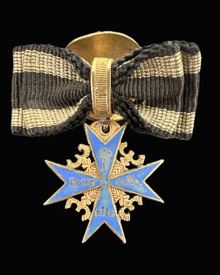This miniature version features the distinctive blue enameled Maltese cross with gilded edges. At its center is the crowned "F" monogram for King Frederick II, encircled by the words “Pour le Mérite” in elegant gold lettering. The medal is suspended from a black and white striped bow, which represents Prussian colors, adding authenticity to this beautiful piece.