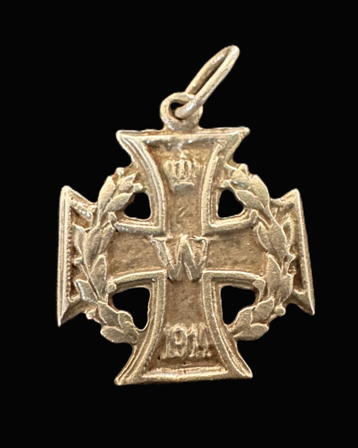 Such pendants were privately purchased keepsakes, worn on chains by soldiers’ families, nurses, and patriotic women throughout the German Empire during World War I. Unlike official decorations, these small-scale silver crosses were made for civilian wear and often mirrored the design of the Iron Cross Second Class awarded for bravery in the field. The laurel border added an ornamental touch, symbolizing not just valor but the hope for peace and triumph amid the hardships of war. Many were sold through Red Cross bazaars or regimental associations to support wartime relief efforts, connecting the home front emotionally and financially to the men at the front.