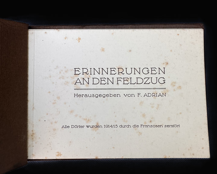 The front cover features bold, period-style text with rope-tied binding, giving it a personal, soldier-made appearance. Inside, the introduction page translates to: “Memories of the Campaign. Edited by F. Adrian. All villages were destroyed in 1914/15 by the French.” This statement sets a reflective tone, capturing the harsh devastation endured by rural regions during the conflict.