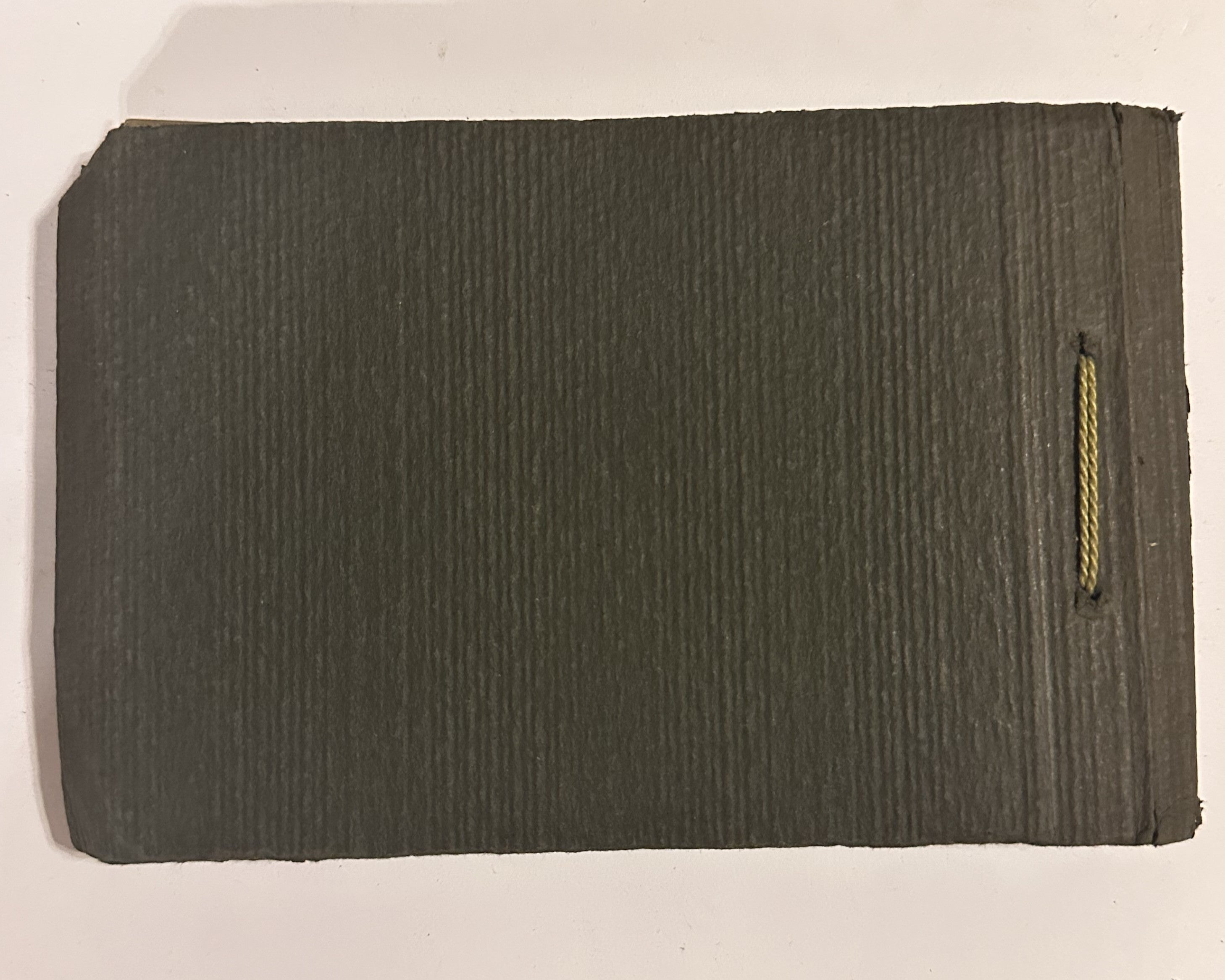 Condition is good overall for a fragile paper item. The covers show honest age wear with edge scuffing, minor corner rounding, and a noticeable clipped/creased corner area at the upper left on one cover. The cord shows age with some fraying and looseness at the ends. The ribbed card stock remains structurally sound, and the interior photo-corner pages visible in the images present well and appear unfilled. Approximate closed size is about 8 3/4 inches wide by 5 1/2 inches tall.
