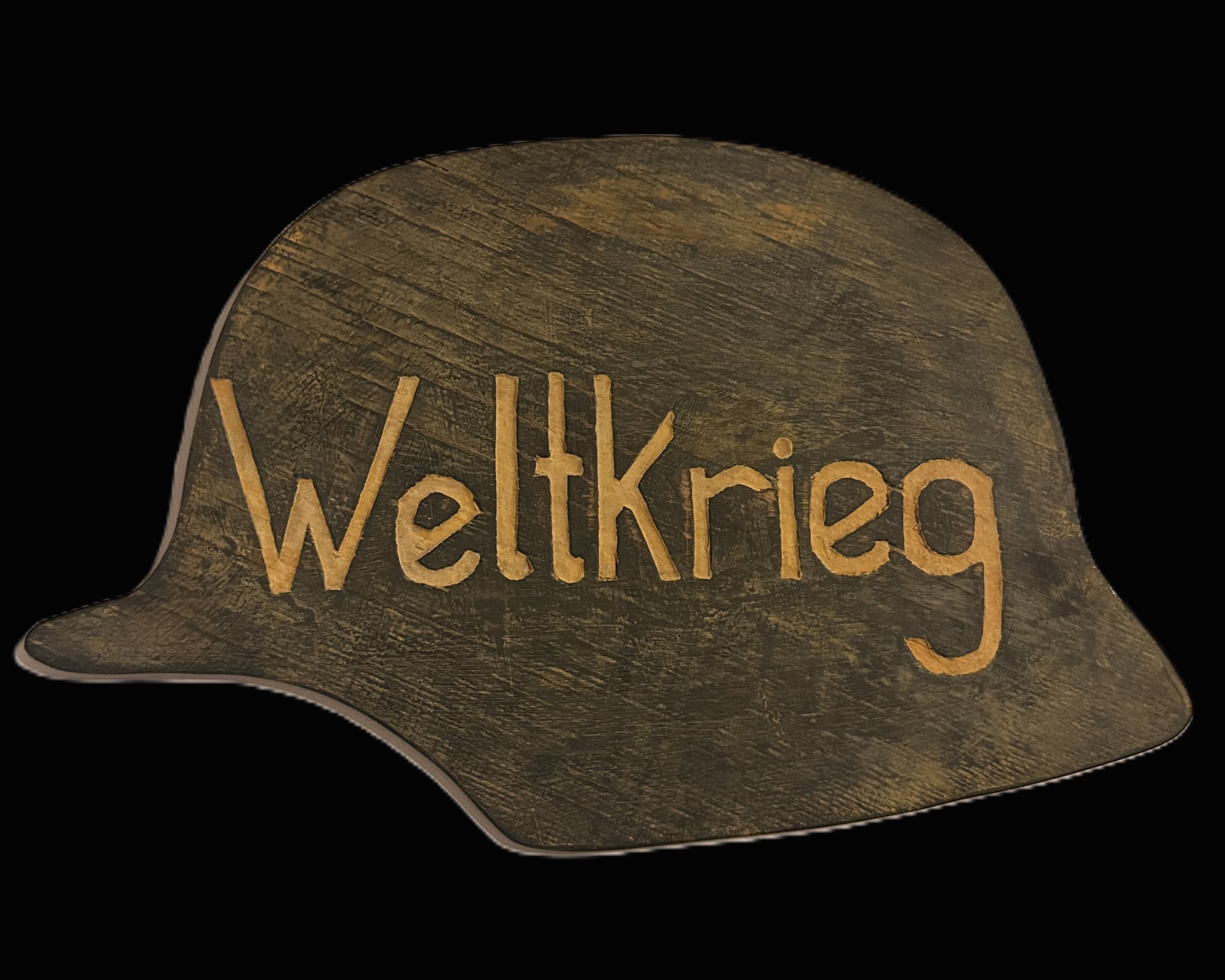 Construction: Flat-back cutout design with hand-incised "Weltkrieg" lettering across the center.